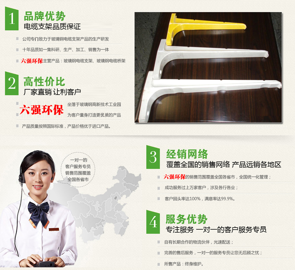 本公司專業生產組合式電纜支架、螺釘式電纜支架、預埋式電纜支架、槽式玻璃鋼電纜橋架、梯式玻璃鋼電纜橋架、托盤式玻璃鋼電纜橋架等。我公司產品多次榮獲國家建設部、國家質量技術監督局、中國玻璃鋼工業協會的嘉獎,并受到全國各地客戶的青睞。我公司被省技術監督局命名為“河北省質量信用管理示范企業”。
